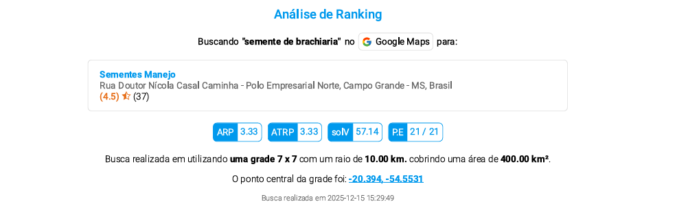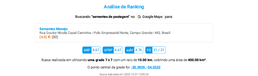 Antes da intervenção, a Sementes Manejo apresentava um Share of Local Voice (SoLV) de apenas 4,76%. Isso significa que, em cada 100 buscas, a empresa aparecia no Top 3 em menos de 5 delas. O Ranking Médio (ARP) era de 6,67, colocando a empresa na “zona morta” da segunda página do Maps.